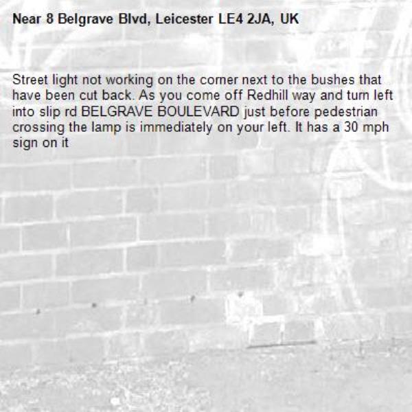 Street light not working on the corner next to the bushes that have been cut back. As you come off Redhill way and turn left into slip rd BELGRAVE BOULEVARD just before pedestrian crossing the lamp is immediately on your left. It has a 30 mph sign on it