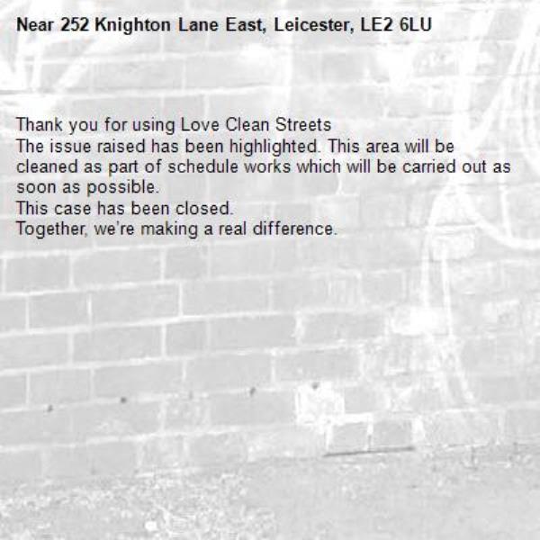 23/03/2026 14:36 Thank you for using Love Clean Streets The issue raised has been highlighted. This area will be cleaned as part of schedule works which will be carried out as soon as possible. This case has been closed. Together, we’re making a real difference.