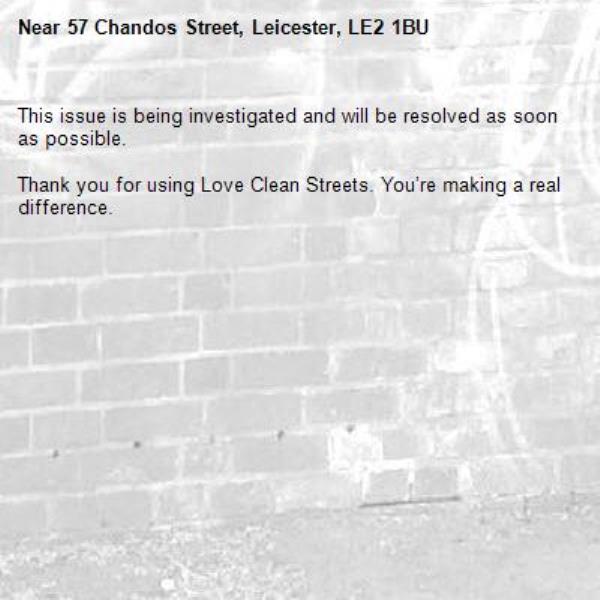 -57 Chandos Street, Leicester, LE2 1BU 28/01/2026 15:11 This issue is being investigated and will be resolved as soon as possible. Thank you for using Love Clean Streets. You’re making a real difference.