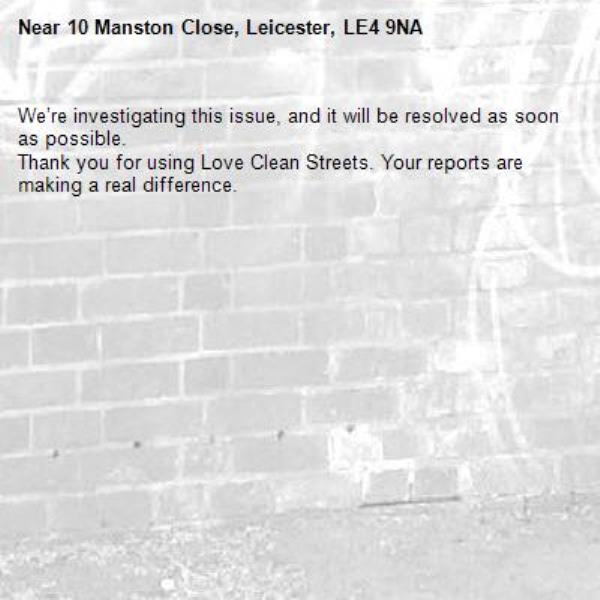 -10 Manston Close, Leicester, LE4 9NA 16/03/2026 10:56 We’re investigating this issue, and it will be resolved as soon as possible. Thank you for using Love Clean Streets. Your reports are making a real difference.