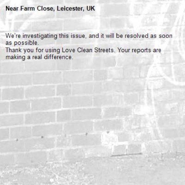 -Farm Close, Leicester, UK 20/10/2025 08:19 We’re investigating this issue, and it will be resolved as soon as possible. Thank you for using Love Clean Streets. Your reports are making a real difference.