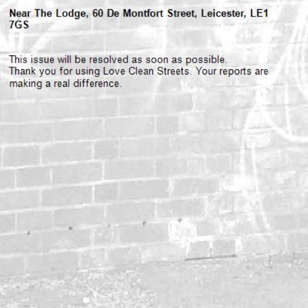 -The Lodge, 60 De Montfort Street, Leicester, LE1 7GS 04/04/2026 10:37 This issue will be resolved as soon as possible. Thank you for using Love Clean Streets. Your reports are making a real difference.