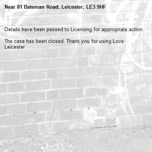 -81 Bateman Road, Leicester, LE3 9HF 20/02/2026 12:47 Details have been passed to Licensing for appropriate action.