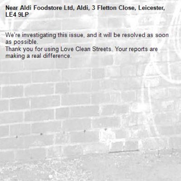 -Aldi Foodstore Ltd, Aldi, 3 Fletton Close, Leicester, LE4 9LP 30/12/2025 10:53 We’re investigating this issue, and it will be resolved as soon as possible. Thank you for using Love Clean Streets. Your reports are making a real difference.