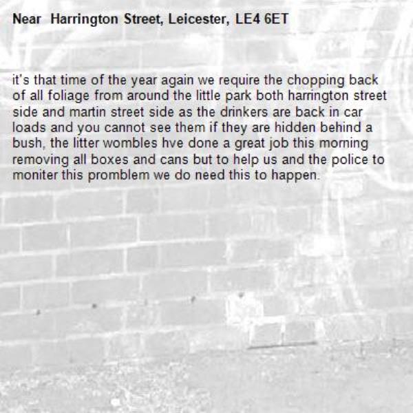 it's that time of the year again we require the chopping back of all foliage from around the little park both harrington street side and martin street side as the drinkers are back in car loads and you cannot see them if they are hidden behind a bush, the litter wombles hve done a great job this morning removing all boxes and cans but to help us and the police to moniter this promblem we do need this to happen.