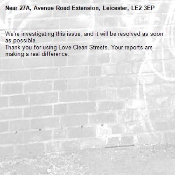 -27A, Avenue Road Extension, Leicester, LE2 3EP 07/01/2026 11:00 We’re investigating this issue, and it will be resolved as soon as possible. Thank you for using Love Clean Streets. Your reports are making a real difference.
