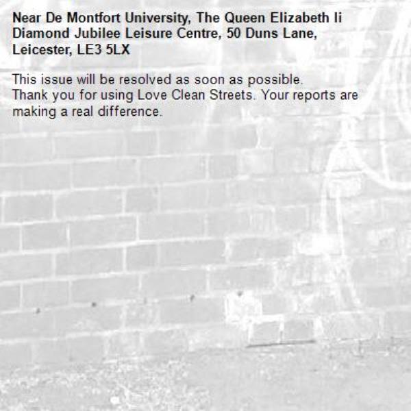 -De Montfort University, The Queen Elizabeth Ii Diamond Jubilee Leisure Centre, 50 Duns Lane, Leicester, LE3 5LX 29/12/2025 07:17 This issue will be resolved as soon as possible. Thank you for using Love Clean Streets. Your reports are making a real difference.