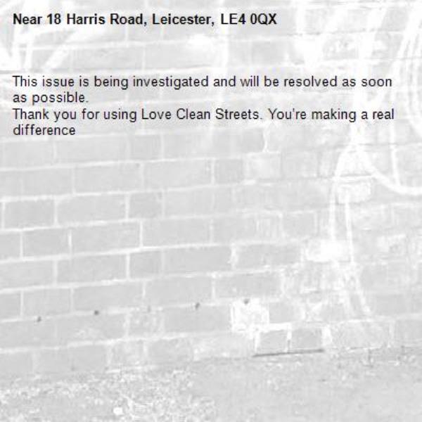 -18 Harris Road, Leicester, LE4 0QX 10/03/2026 10:45 This issue is being investigated and will be resolved as soon as possible. Thank you for using Love Clean Streets. You’re making a real difference