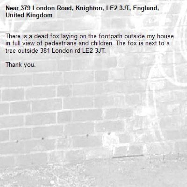 There is a dead fox laying on the footpath outside my house in full view of pedestrians and children. The fox is next to a tree outside 381 London rd LE2 3JT.