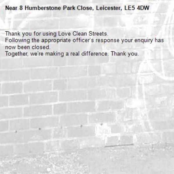 -8 Humberstone Park Close, Leicester, LE5 4DW 13/04/2026 11:33 Thank you for using Love Clean Streets.