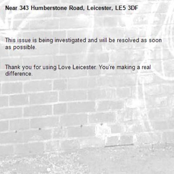 -343 Humberstone Road, Leicester, LE5 3DF 31/01/2026 15:14 This issue is being investigated and will be resolved as soon as possible. Thank you for using Love Leicester. You’re making a real difference.