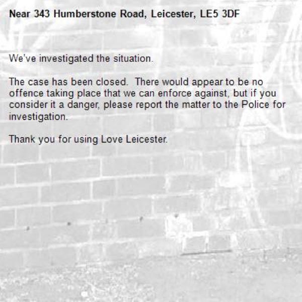 -343 Humberstone Road, Leicester, LE5 3DF 31/01/2026 15:43 We’ve investigated the situation. The case has been closed. There would appear to be no offence taking place that we can enforce against, but if you consider it a danger, please report the matter to the Police for investigation. Thank you for using Love Leicester.