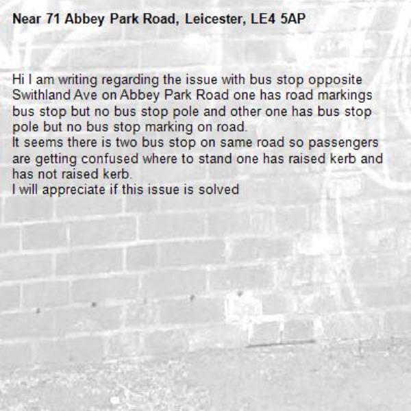 Hi I am writing regarding the issue with bus stop opposite Swithland Ave on Abbey Park Road one has road markings bus stop but no bus stop pole and other one has bus stop pole but no bus stop marking on road.