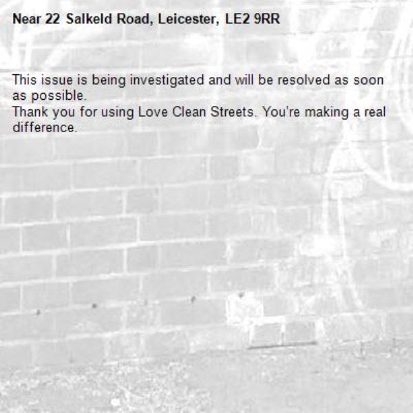 -22 Salkeld Road, Leicester, LE2 9RR 23/04/2026 09:59 This issue is being investigated and will be resolved as soon as possible. Thank you for using Love Clean Streets. You’re making a real difference.