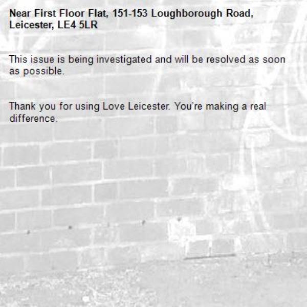 -First Floor Flat, 151-153 Loughborough Road, Leicester, LE4 5LR 19/02/2026 11:11 This issue is being investigated and will be resolved as soon as possible. Thank you for using Love Leicester. You’re making a real difference.