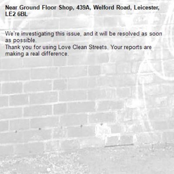 -Ground Floor Shop, 439A, Welford Road, Leicester, LE2 6BL 30/01/2026 11:59 We’re investigating this issue, and it will be resolved as soon as possible. Thank you for using Love Clean Streets. Your reports are making a real difference.