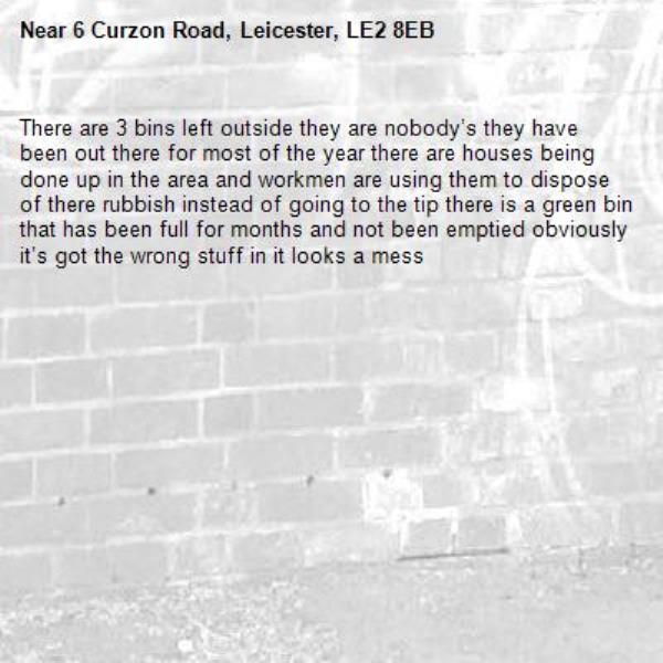 There are 3 bins left outside they are nobody’s they have been out there for most of the year there are houses being done up in the area and workmen are using them to dispose of there rubbish instead of going to the tip there is a green bin that has been full for months and not been emptied obviously it’s got the wrong stuff in it looks a mess