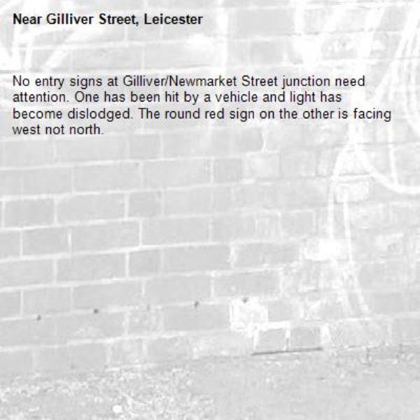 No entry signs at Gilliver/Newmarket Street junction need attention. One has been hit by a vehicle and light has become dislodged. The round red sign on the other is facing west not north.