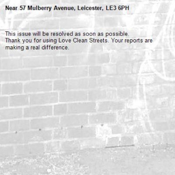 -57 Mulberry Avenue, Leicester, LE3 6PH 01/04/2026 08:02 This issue will be resolved as soon as possible. Thank you for using Love Clean Streets. Your reports are making a real difference.