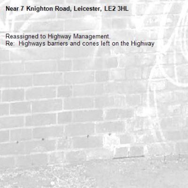 Re:  Highways barriers and cones left on the Highway-7 Knighton Road, Leicester, LE2 3HL 06/11/2025 15:42 Reassigned to Highway Management. Re: Highways barriers and cones left on the Highway