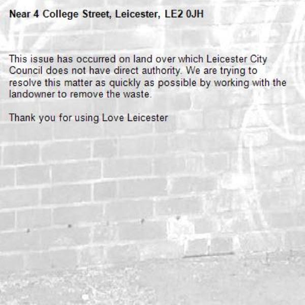 -4 College Street, Leicester, LE2 0JH 04/03/2026 15:04 This issue has occurred on land over which Leicester City Council does not have direct authority. We are trying to resolve this matter as quickly as possible by working with the landowner to remove the waste.