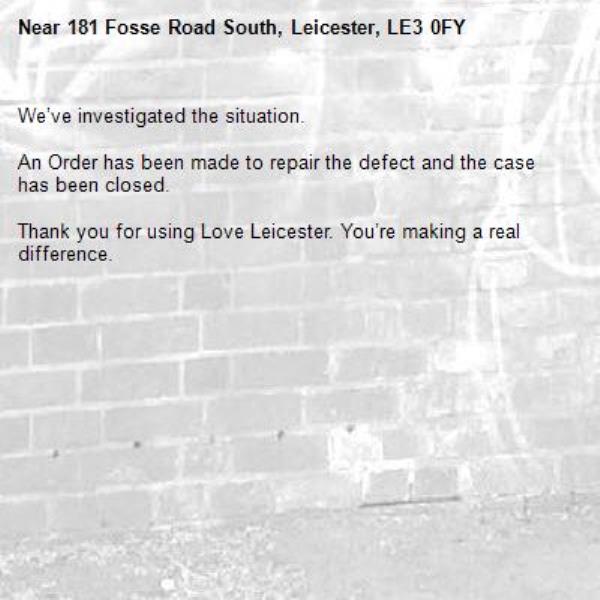 -181 Fosse Road South, Leicester, LE3 0FY 31/03/2026 09:30 We’ve investigated the situation. An Order has been made to repair the defect and the case has been closed. Thank you for using Love Leicester. You’re making a real difference.