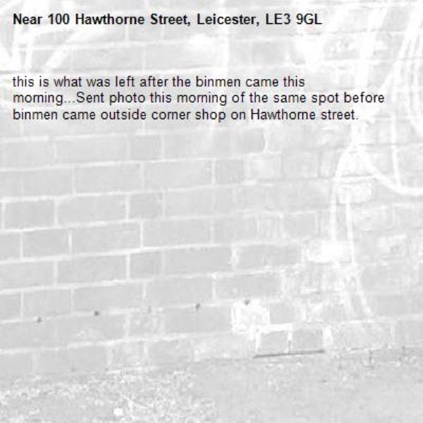 this is what was left after the binmen came this morning...Sent photo this morning of the same spot before binmen came outside corner shop on Hawthorne street.