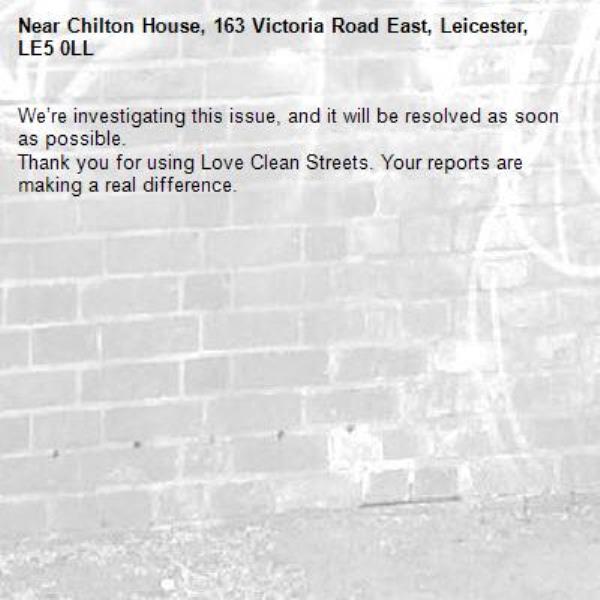 -Chilton House, 163 Victoria Road East, Leicester, LE5 0LL 19/03/2026 07:56 We’re investigating this issue, and it will be resolved as soon as possible. Thank you for using Love Clean Streets. Your reports are making a real difference.