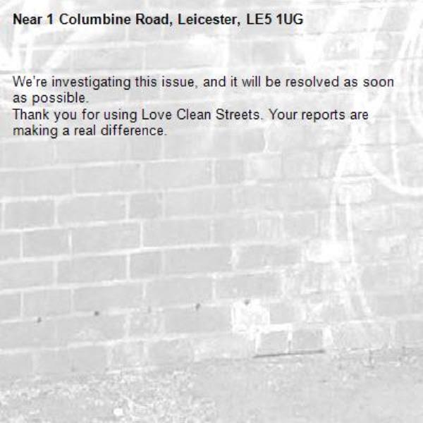 -1 Columbine Road, Leicester, LE5 1UG 27/02/2026 12:39 We’re investigating this issue, and it will be resolved as soon as possible. Thank you for using Love Clean Streets. Your reports are making a real difference.