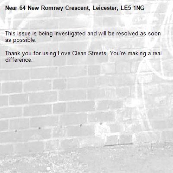 -64 New Romney Crescent, Leicester, LE5 1NG 23/04/2026 10:05 This issue is being investigated and will be resolved as soon as possible. Thank you for using Love Clean Streets .You’re making a real difference.