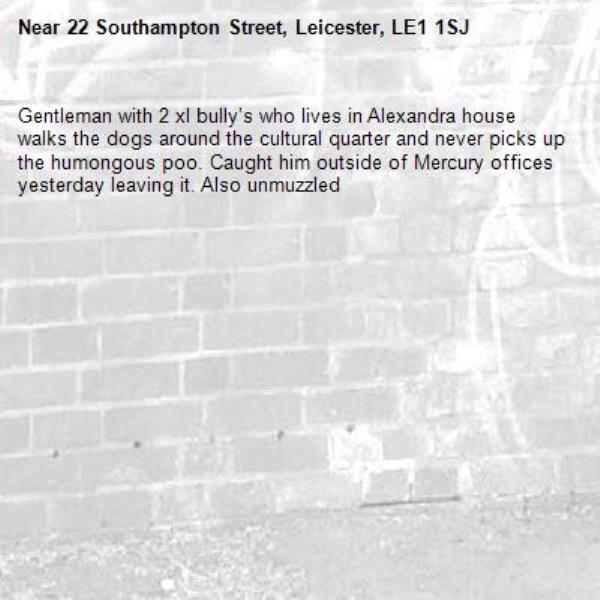 Gentleman with 2 xl bully’s who lives in Alexandra house walks the dogs around the cultural quarter and never picks up the humongous poo. Caught him outside of Mercury offices yesterday leaving it. Also unmuzzled