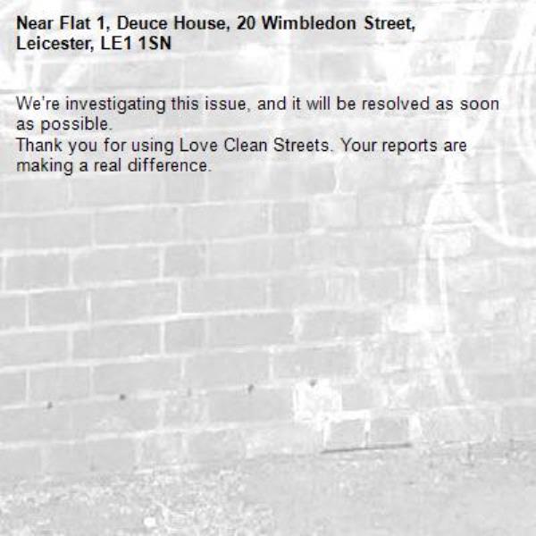 -Flat 1, Deuce House, 20 Wimbledon Street, Leicester, LE1 1SN 05/12/2025 10:06 We’re investigating this issue, and it will be resolved as soon as possible. Thank you for using Love Clean Streets. Your reports are making a real difference.