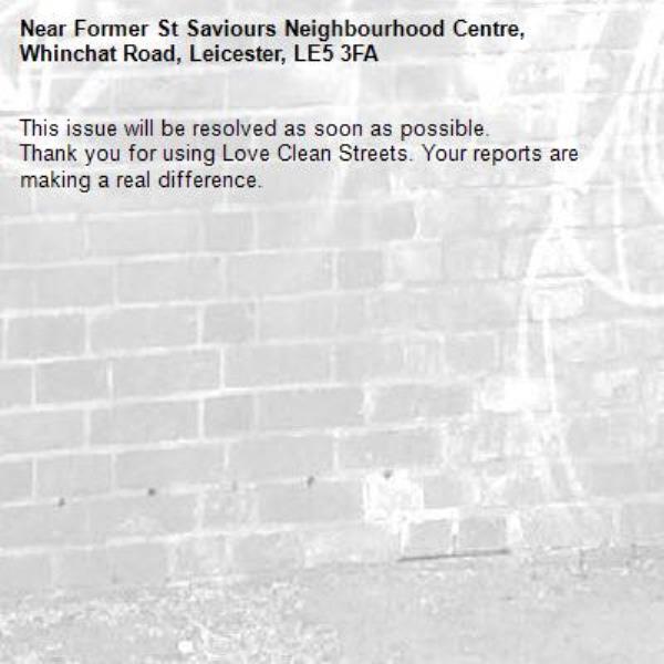 -Former St Saviours Neighbourhood Centre, Whinchat Road, Leicester, LE5 3FA 13/11/2025 07:50 This issue will be resolved as soon as possible. Thank you for using Love Clean Streets. Your reports are making a real difference.