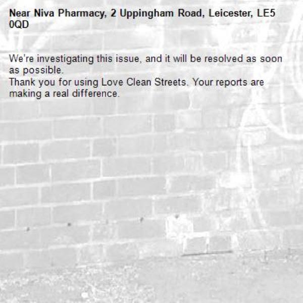 -Niva Pharmacy, 2 Uppingham Road, Leicester, LE5 0QD 20/11/2025 08:13 We’re investigating this issue, and it will be resolved as soon as possible. Thank you for using Love Clean Streets. Your reports are making a real difference.