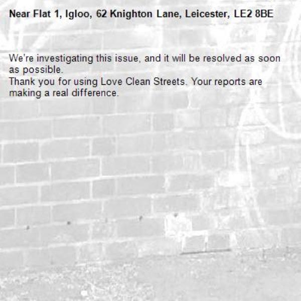 -Flat 1, Igloo, 62 Knighton Lane, Leicester, LE2 8BE 04/12/2025 10:30 We’re investigating this issue, and it will be resolved as soon as possible. Thank you for using Love Clean Streets. Your reports are making a real difference.
