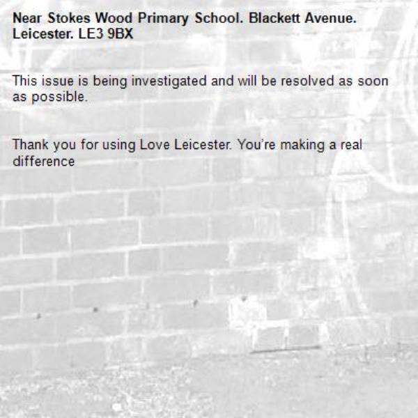 -Stokes Wood Primary School. Blackett Avenue. Leicester. LE3 9BX 01/12/2025 17:36 This issue is being investigated and will be resolved as soon as possible. Thank you for using Love Leicester. You’re making a real difference