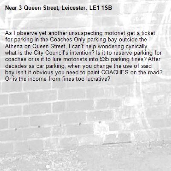 As I observe yet another unsuspecting motorist get a ticket for parking in the Coaches Only parking bay outside the Athena on Queen Street, I can’t help wondering cynically what is the City Council’s intention? Is it to reserve parking for coaches or is it to lure motorists into £35 parking fines? After decades as car parking, when you change the use of said bay isn’t it obvious you need to paint COACHES on the road? Or is the income from fines too lucrative?