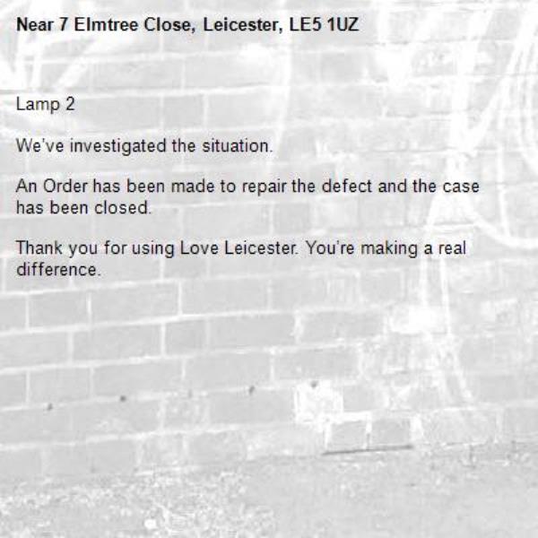 -7 Elmtree Close, Leicester, LE5 1UZ 27/01/2026 10:43 Lamp 2 We’ve investigated the situation. An Order has been made to repair the defect and the case has been closed. Thank you for using Love Leicester. You’re making a real difference.