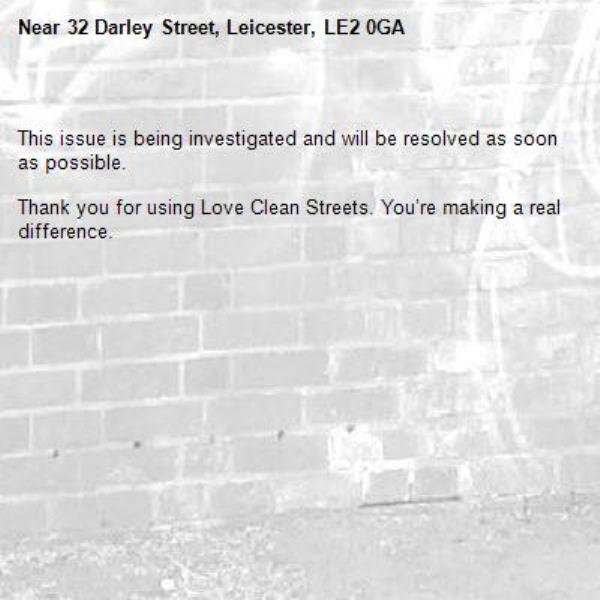 -32 Darley Street, Leicester, LE2 0GA 10/04/2026 11:18 This issue is being investigated and will be resolved as soon as possible. Thank you for using Love Clean Streets. You’re making a real difference.