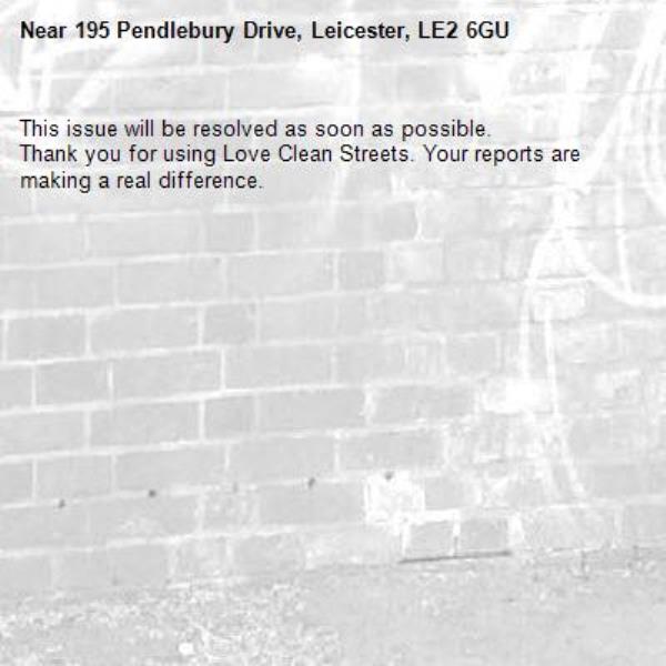 -195 Pendlebury Drive, Leicester, LE2 6GU 01/04/2026 09:18 This issue will be resolved as soon as possible. Thank you for using Love Clean Streets. Your reports are making a real difference.