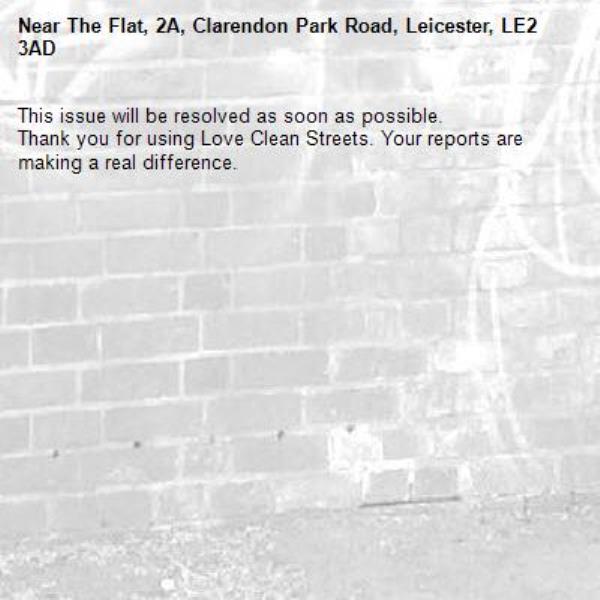 -The Flat, 2A, Clarendon Park Road, Leicester, LE2 3AD 17/11/2025 09:25 This issue will be resolved as soon as possible. Thank you for using Love Clean Streets. Your reports are making a real difference.