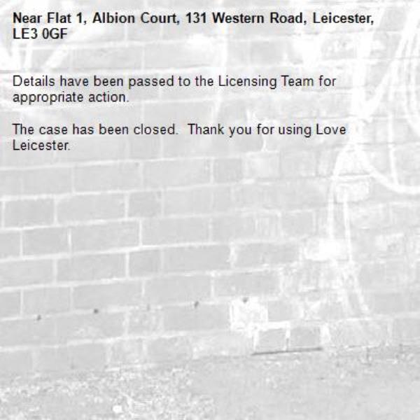 The case has been closed.  Thank you for using Love Leicester.-Flat 1, Albion Court, 131 Western Road, Leicester, LE3 0GF 08/04/2026 15:18 Details have been passed to the Licensing Team for appropriate action. The case has been closed. Thank you for using Love Leicester.
