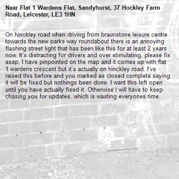 On hinckley road when driving from braunstone leisure centre towards the new parks way roundabout there is an annoying flashing street light that has been like this for at least 2 years now. It's distracting for drivers and over stimulating, please fix asap. I have pinpointed on the map and it comes up with flat 1 wardens crescent but it's actually on hinckley road. I've raised this before and you marked as closed complete saying it will be fixed but nothings been done. I want this left open until you have actually fixed it. Otherwise I will have to keep chasing you for updates, which is wasting everyones time.
