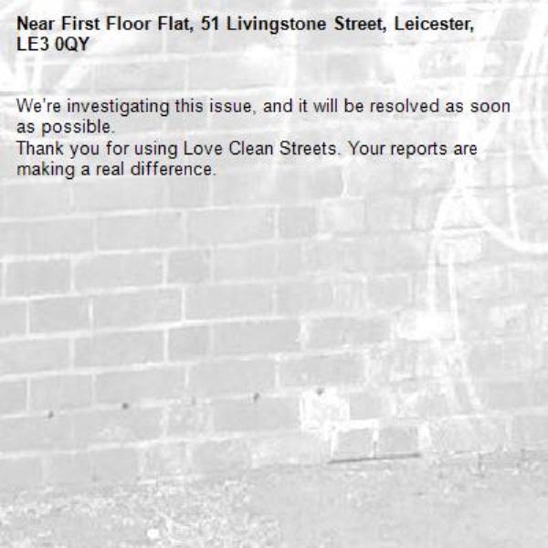 -First Floor Flat, 51 Livingstone Street, Leicester, LE3 0QY 13/03/2026 11:29 We’re investigating this issue, and it will be resolved as soon as possible. Thank you for using Love Clean Streets. Your reports are making a real difference.