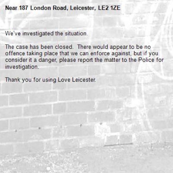-187 London Road, Leicester, LE2 1ZE 25/04/2026 12:10 We’ve investigated the situation. The case has been closed. There would appear to be no offence taking place that we can enforce against, but if you consider it a danger, please report the matter to the Police for investigation. Thank you for using Love Leicester.