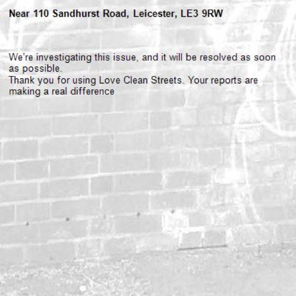 -110 Sandhurst Road, Leicester, LE3 9RW 09/04/2026 07:34 We’re investigating this issue, and it will be resolved as soon as possible. Thank you for using Love Clean Streets. Your reports are making a real difference