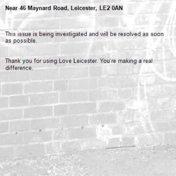 -46 Maynard Road, Leicester, LE2 0AN 11/02/2026 14:16 This issue is being investigated and will be resolved as soon as possible. Thank you for using Love Leicester. You’re making a real difference.