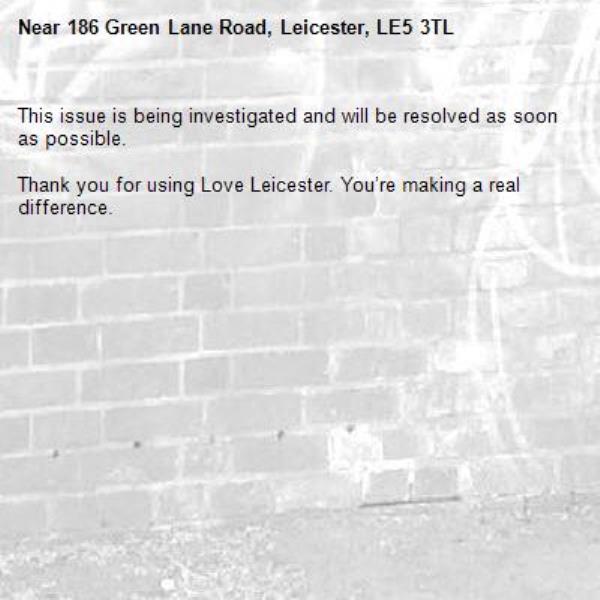 -186 Green Lane Road, Leicester, LE5 3TL 07/04/2026 11:01 This issue is being investigated and will be resolved as soon as possible. Thank you for using Love Leicester. You’re making a real difference.
