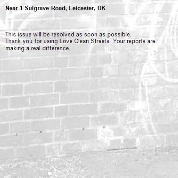 -1 Sulgrave Road, Leicester, UK 09/01/2026 12:14 This issue will be resolved as soon as possible. Thank you for using Love Clean Streets. Your reports are making a real difference.