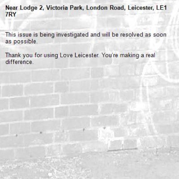 -Lodge 2, Victoria Park, London Road, Leicester, LE1 7RY 19/03/2026 11:49 This issue is being investigated and will be resolved as soon as possible. Thank you for using Love Leicester. You’re making a real difference.